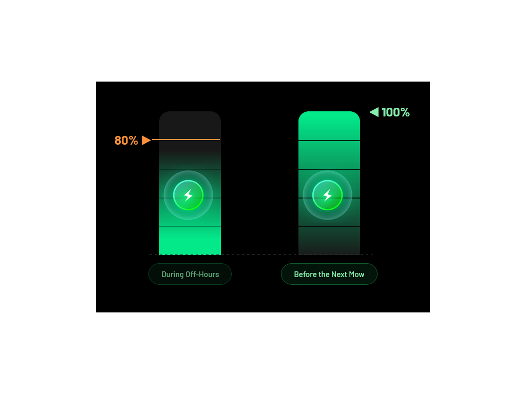 Automatické dobíjanie: Pri poklese kapacity batérie pod 15 % sa kosačka sama vráti do nabíjacej stanice. Po dobití (vďaka silnej 12 Ah batérii) automaticky pokračuje v práci presne tam, kde skončila.